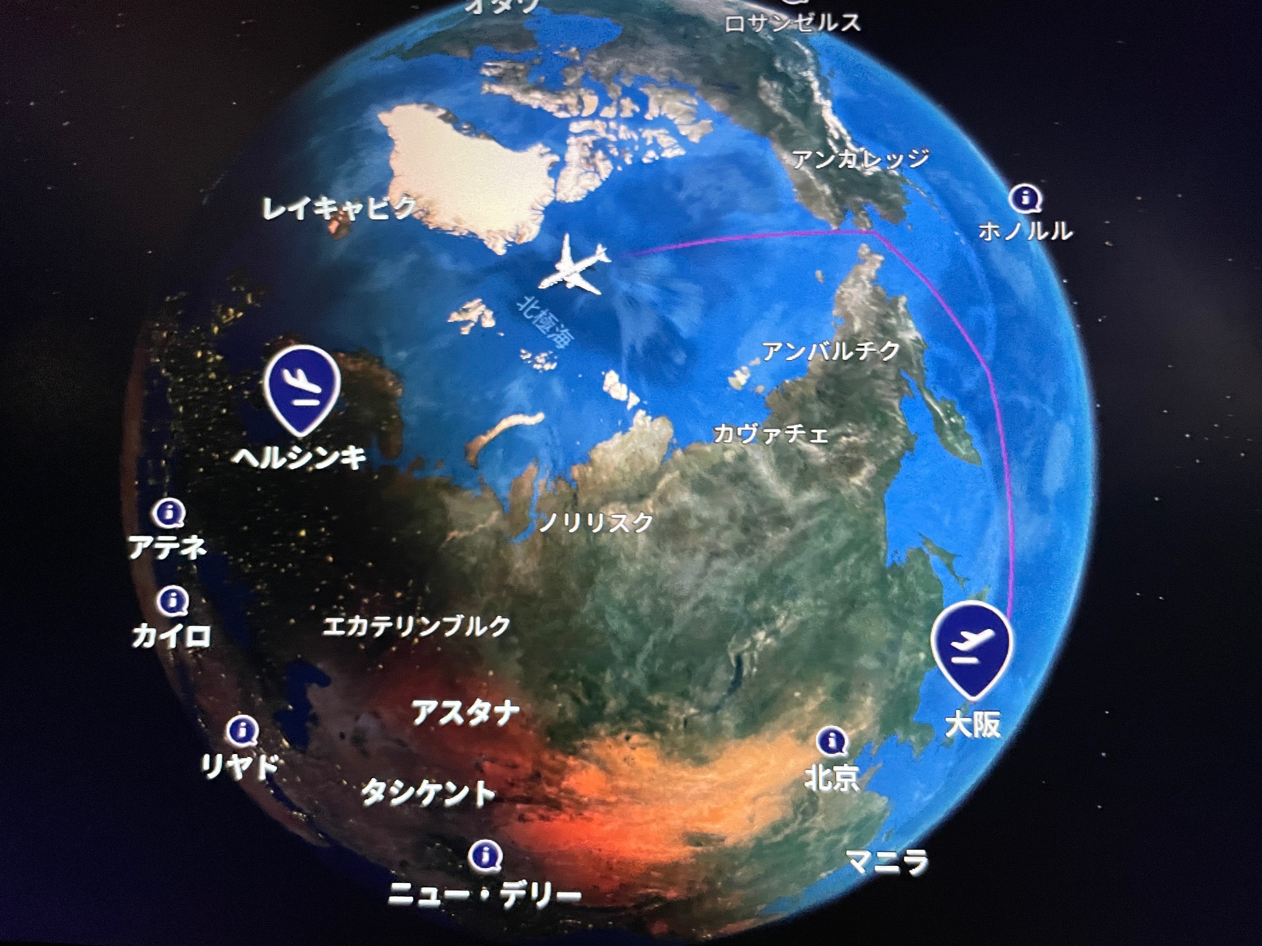 今回は、行きは北極ルート、帰りは中央アジアルートでした。