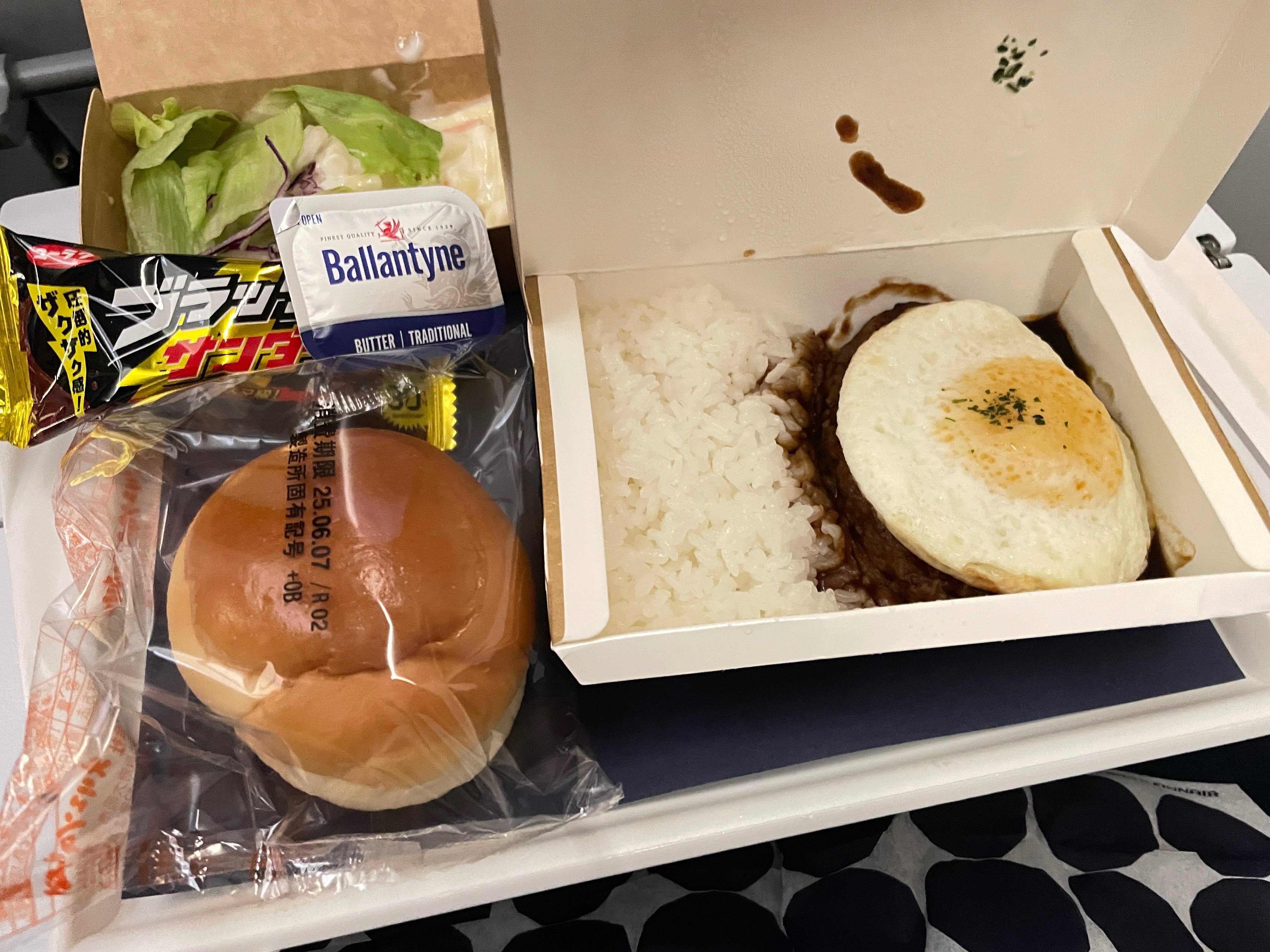 意外とお腹が膨れたため、パンは明日の朝にだべることにしたのですが、これが、後ほど分かるがナイス選択でした。お菓子はキットカット。酒も頼めたようだが酒は飲めないのでスルー。ブルーベリージュースを飲み、映画を見たり、音楽を聴いたりしてくつろぎました。