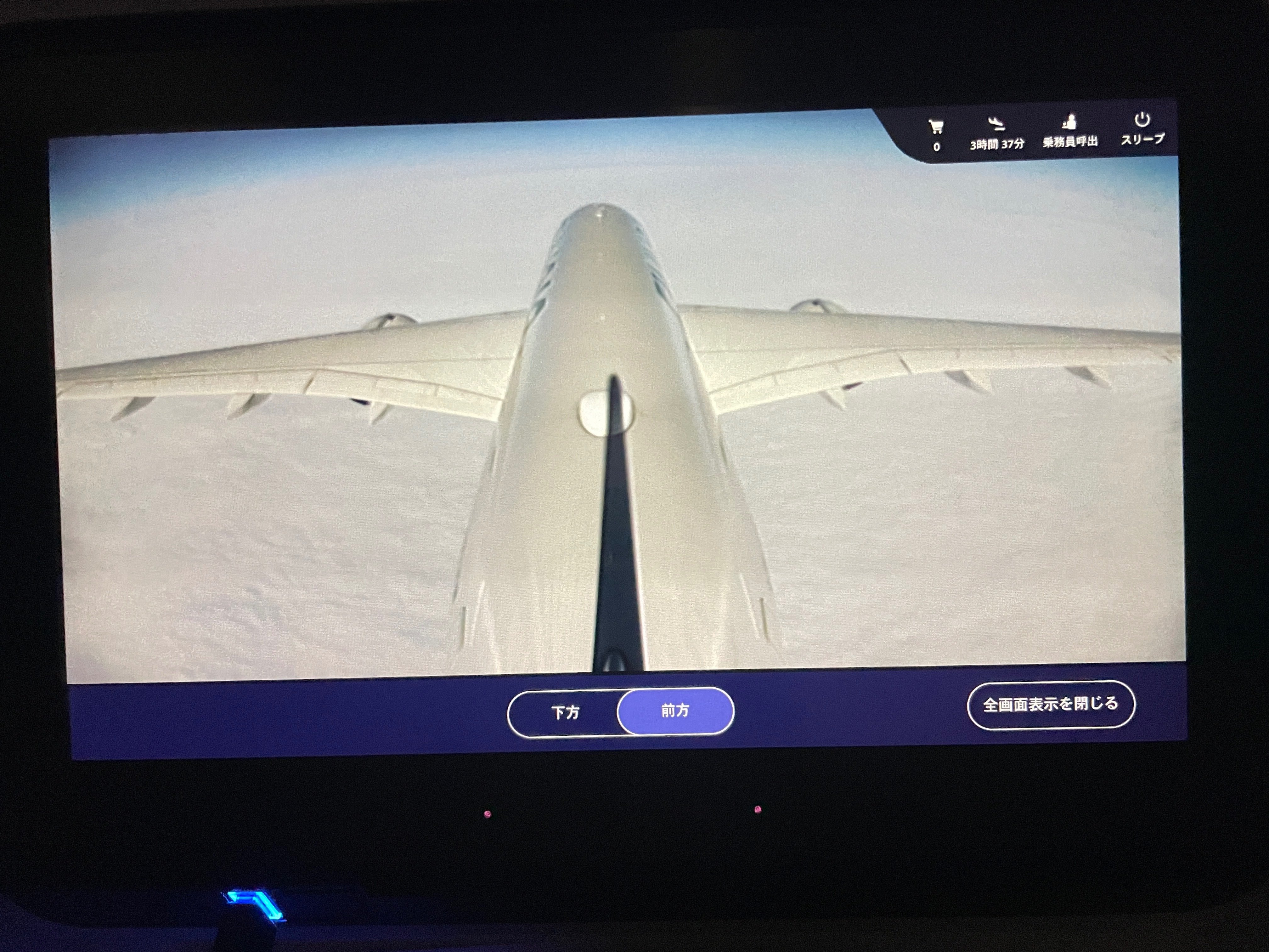 首がバキバキ状態で早朝に目が覚めると、北極上空を飛行していました。(外の景色も見たかったですが、明るくなってしまうのでスクリーンで我慢。)
